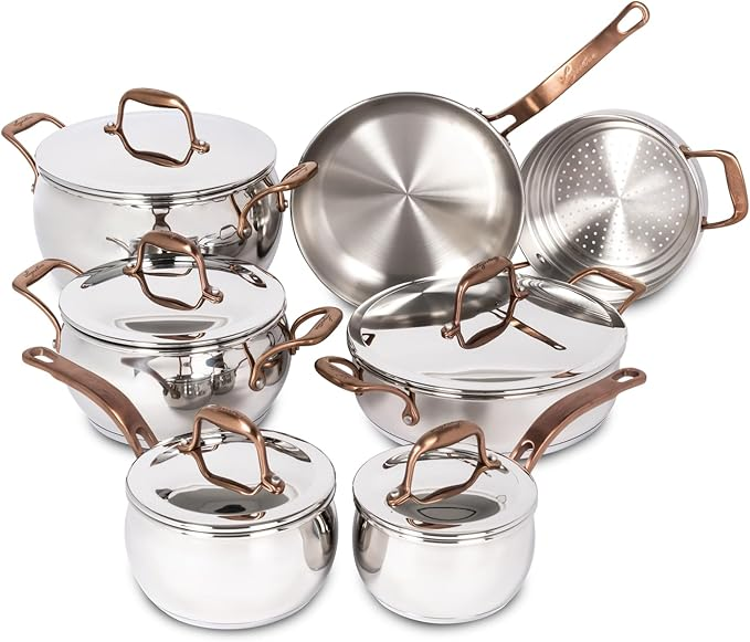 This professional-quality set includes saucepans, sauté pans, skillets, a stockpot, and tight-fitting lids — all made with triple-ply construction for even heating and minimal hot spots.